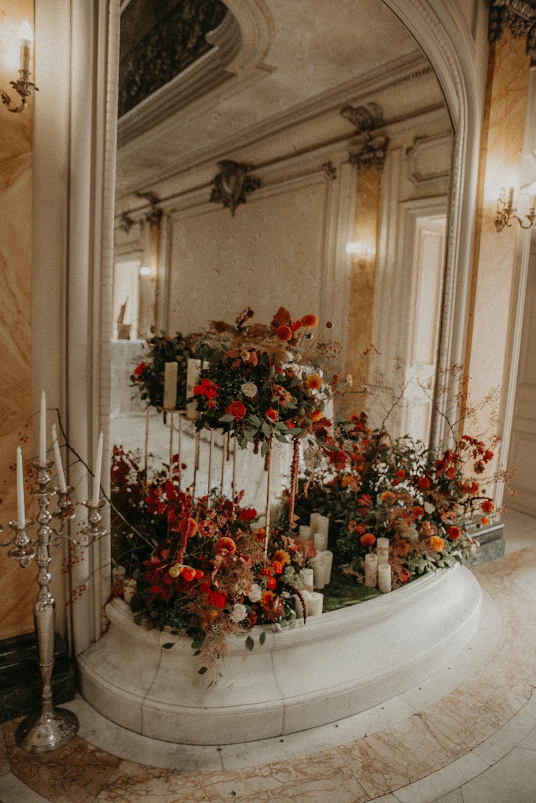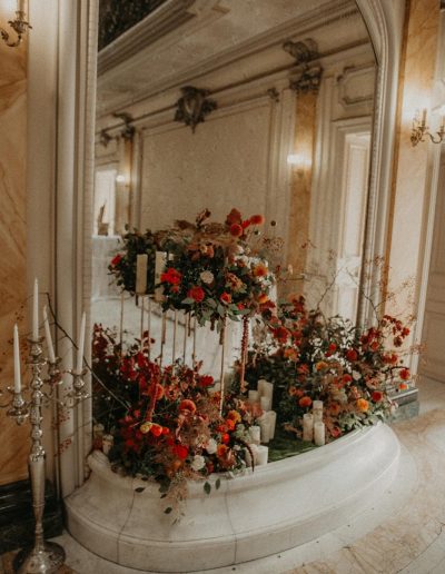 La salle rouge est la plus opulente avec ses deux colonnes en marbre rouge, ses dorures au cuivre qui magnifient tous les détails du plafond, des portes et des murs couverts par endroits de tapisseries de soie satinée rouge.