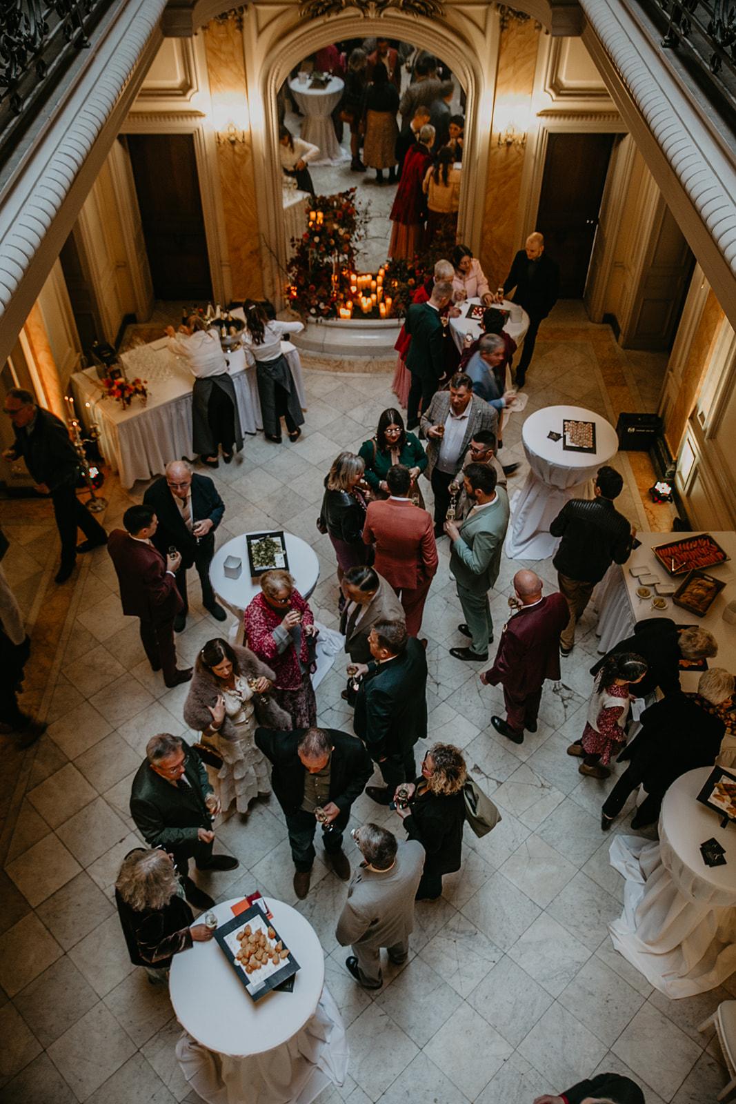 Le hall présente des colonnes de styles ioniques et corinthiennes (tout comme la salle rouge) et est orné de marbre jaune. Il est au centre du château et s’ouvre sur toutes les pièces et sur tous les étages.