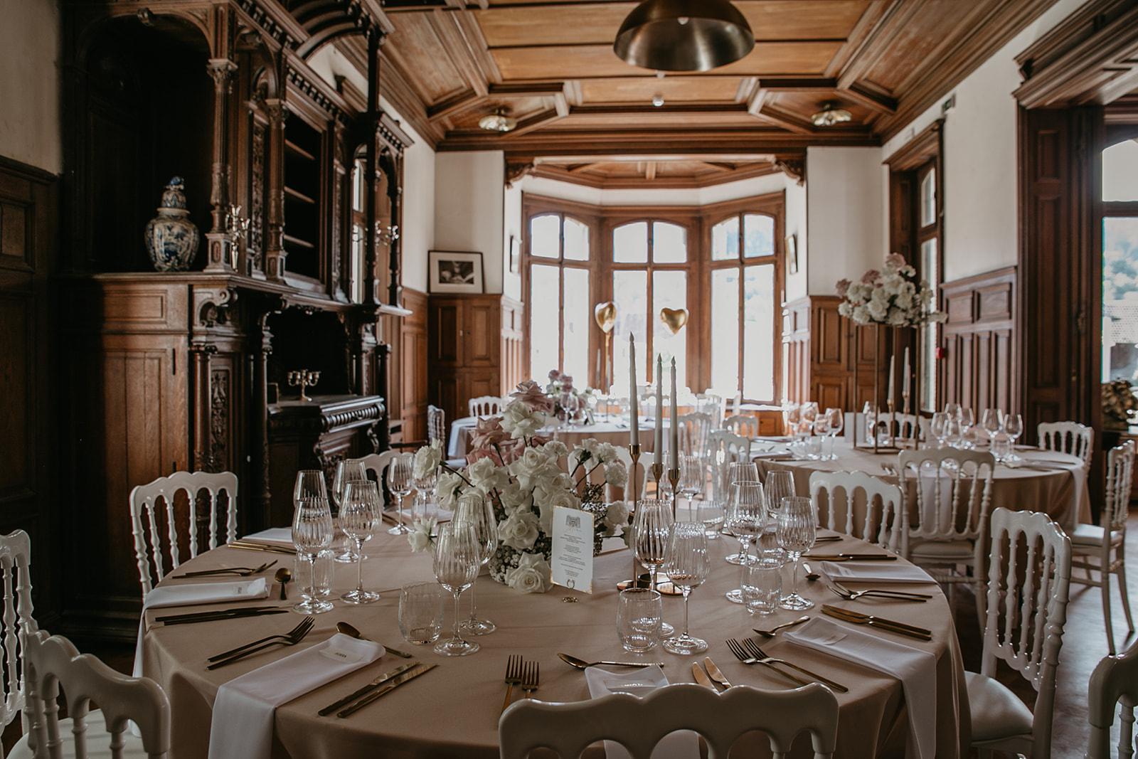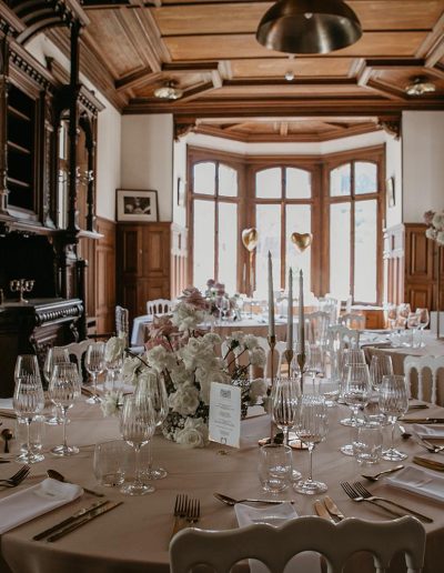 La salle en bois est comme son nom l’indique, toute en bois du sol au plafond ainsi qu’une moitié de mur recouvert de tapisserie en carton repoussé. Un meuble de style renaissance trône fièrement dans la pièce.